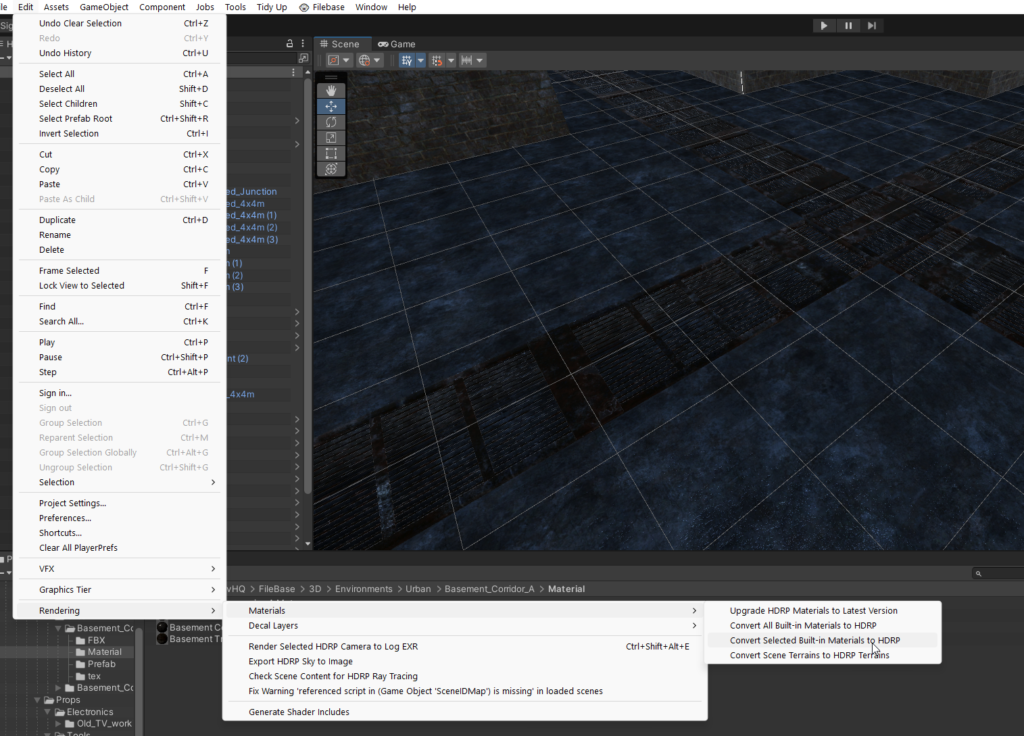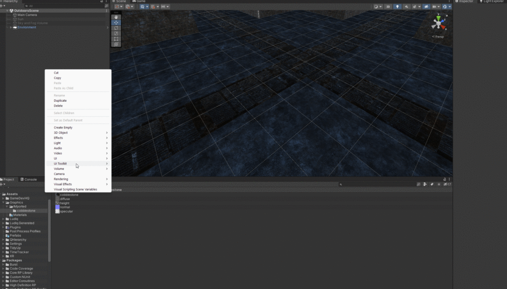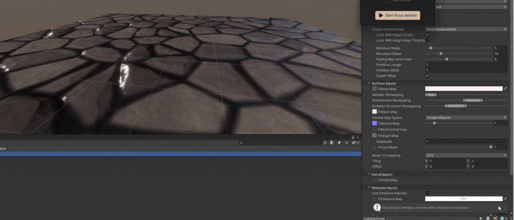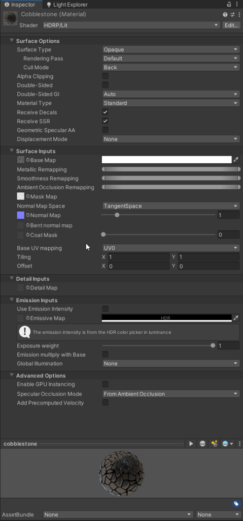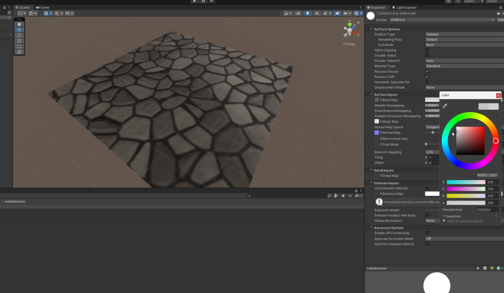 Start by selecting a texture with an interesting pattern such as a cobblestone street. I’m going to use this cobblestone texture (found here on Open Game Art) with a texture, height map, normal, and diffuse map. When importing new materials into the project is will be important to convert them to the HDR pipeline by selecting them and using converter provided by Unity by going to Edit>Rendering>Materials>Convert>Selected Built-in Materials to HDRP