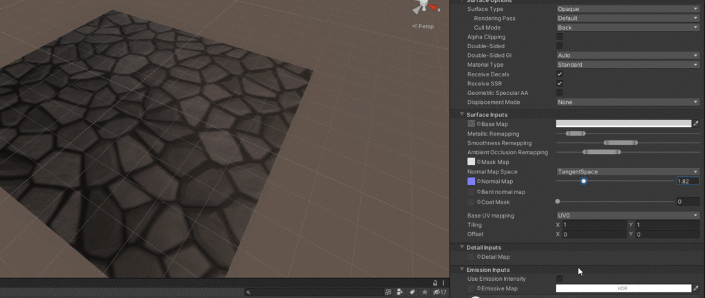 Tweak the values of the smoothness, metallic finish, and normal map until you get the desired look. You can also change the direction of the light source to enhance the depth of the texture until you get the right look.