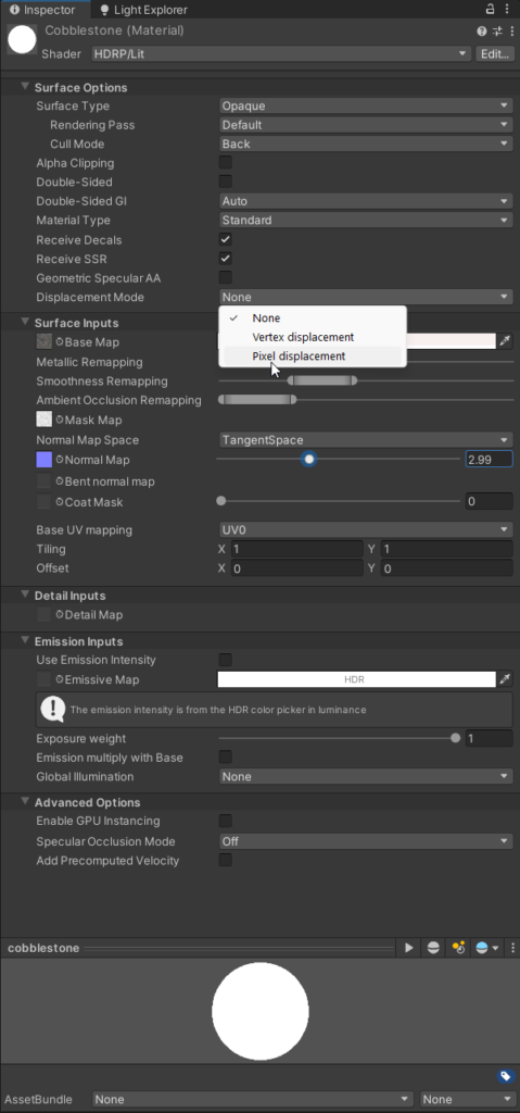 Next we’ll take the included height map (creating a height map is a fairly involved process with an image editor and could be an article all by itself for ease we chose an asset with one included) and using the Pixel Displacement feature under the Material’s Displacement Mode drop down.