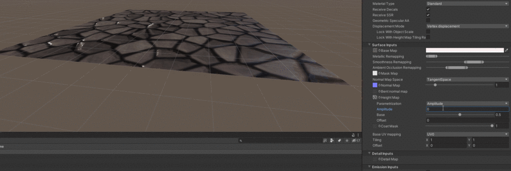 The alternative mode is Vertex Displacement this change the geometry of the entire plane to create the illusion of depth. The default parameterization is Min/Max but let’s change this Amplitude and see how it changes the plane as we change it rapidly.